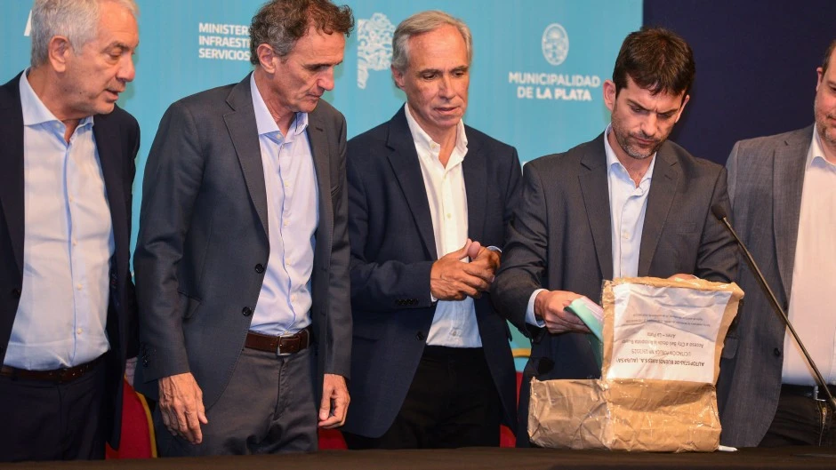 El intendente de La Plata, Julio Alak, y el ministro de Infraestructura y Servicios Públicos de la provincia de Buenos Aires, Gabriel Katopodis, encabezaron el acto de licitación pública para la construcción del nuevo distribuidor de la Autopista Buenos Aires–La Plata en la bajada de City Bell, junto al presidente de Aubasa, José Arteaga.